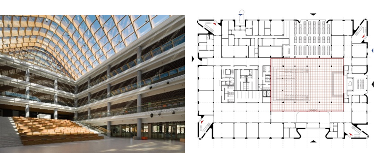 Например, школа в «Евробереге» города Новосибирска, демонстрирующая высокую степень адаптивности к изменениям. Эта адаптивность проявляется как ответ на динамику событий, происходящих в течение дня, так и в контексте предстоящих изменений, ожидаемых в течение следующего десятилетия, что свидетельствует о гибкости проектируемых пространств. Все классы кросс-функциональны и могут использоваться для изучения нескольких предметов. Принцип гибкости также заложен в рекреациях. В целом они предназначены для отдыха, но быстро трансформируются в рабочие полигоны или актовый зал: мобильная мебель помогает адаптировать рекреацию под задачи образовательного процесса или школьной жизни — праздники, концерты, спектакли. Сердце школы — атриум, что обеспечивает не только многофункциональное, гибкое пространство, но и добавляет естественное освещение (Рис. 2).