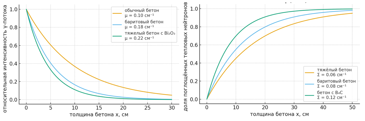 На графике (а) показано, как уменьшается относительная интенсивность γ-излучения с ростом толщины слоя бетона при разных значениях μ. На графике (б) показано, как растёт доля поглощенных нейтронов с увеличением толщины слоя при разных значениях Σ. Для бетона без бора требуется толщина порядка 40–50 см, чтобы поглотить ~90 % тепловых нейтронов. Для бетона с добавками бора примерно та же степень защиты достигается уже при толщине порядка 20 см.