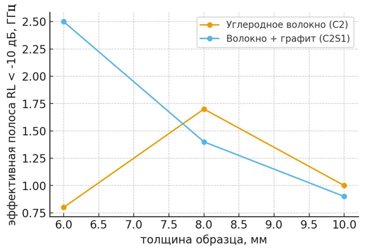 Авторы проводили измерения отражательной способности материала) в диапазоне 2–18 ГГц для образцов различной толщины (6, 8 и 10 мм). Эффективной считается область, где уровень отражения RL<−10 дБ, что соответствует поглощению более 90 % падающей мощности электромагнитной волны. Ширина этих интервалов (0,8–2,5 ГГц) использована на графике для анализа зависимости эффективной полосы поглощения от толщины образца.