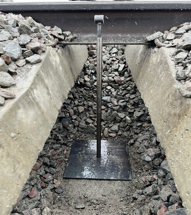 Опытный участок оборудован деформационными марками, установленными на подбалластный асфальтобетонный слой или основную площадку земляного полотна. Общий вид деформационной марки приведен на Рис. 4. Глубина установки марок составила 45 см под подошвой шпалы. Для установки деформационных марок были вырыты шурфы.