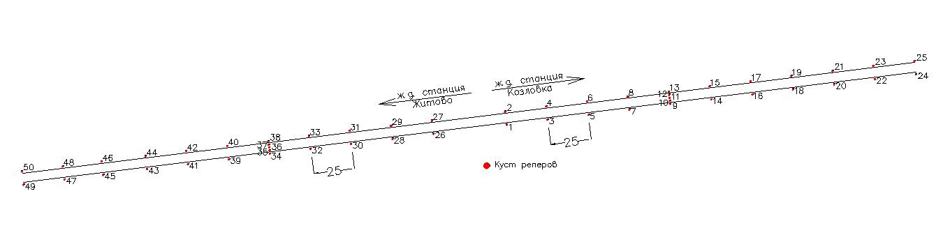 Марки установлены как в продольном, так и в поперечном оси пути направлении. Общая схема установки деформационных марок на основную площадку земляного полотна представлена на Рис. 5, 6.