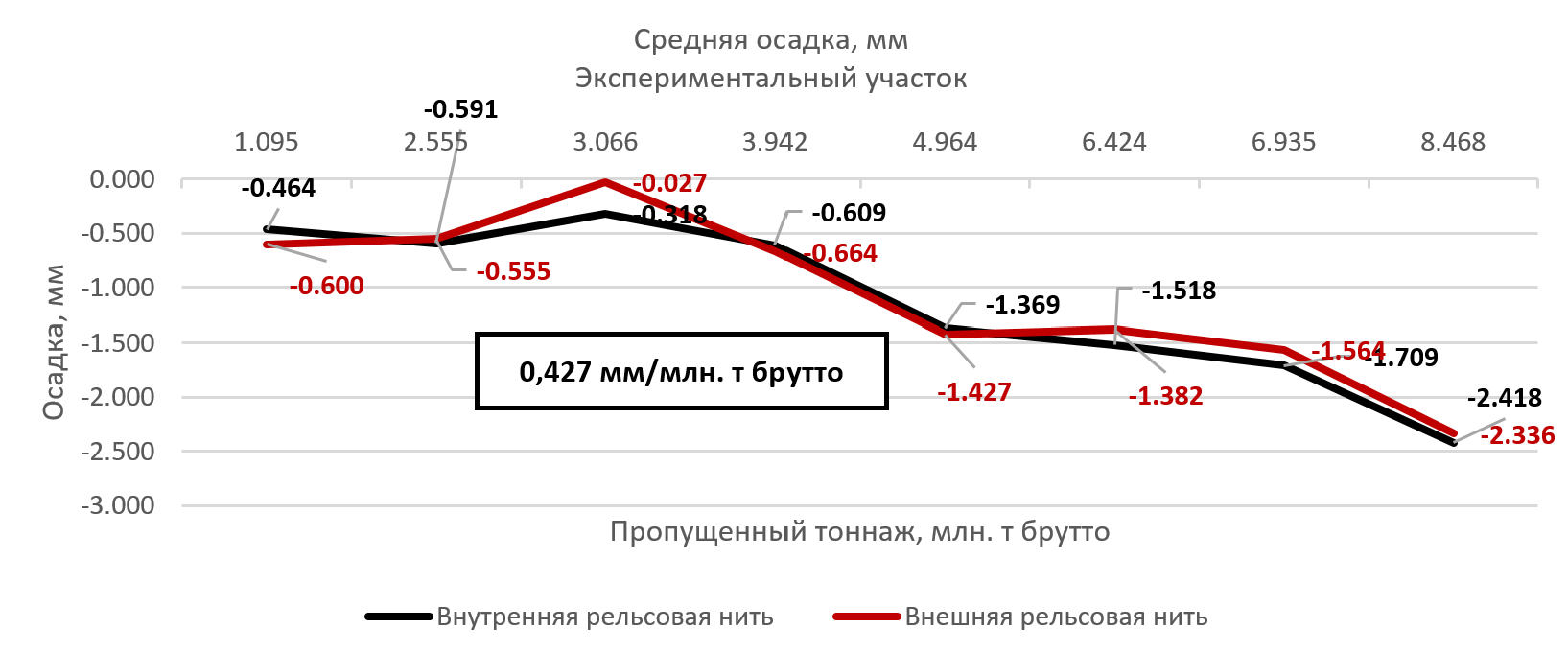 - на участке устройства подбалластного асфальтобетонного слоя – 0,427 мм / млн. тонн брутто пропущенного тоннажа;
