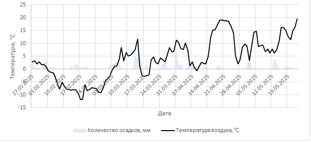 Рис. 12. График изменения температуры воздуха, количества осадков на период наблюдений
