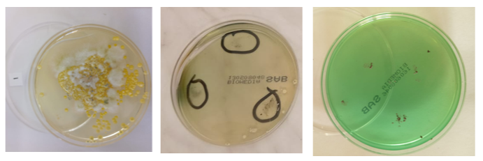 Для получения культур плесневых грибов р. Penicillium и р. Aspergillus нами использовалась готовая питательная среда Сабуро органического происхождения. Посев воздушной микрофлоры на питательную среду проводился в соответствии с общепринятой методикой культивирования микроорганизмов. На поверхности питательной среды на 3-и сутки появились видимые невооруженным глазом колонии плесневых грибов, идентифицированные как представители р. Penicillium и р. Aspergillus согласно определителю Курсанов А. И.1 (Рис. 3).