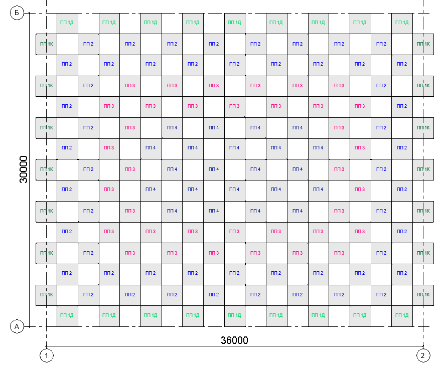 После создания информационной модели структурного элемента произведена загрузка в проект и компоновка геометрии всего покрытия (Рис. 5), созданы типоразмеры согласно расчетам. Всем типоразмерам присвоен необходимый процент фибрового армирования.