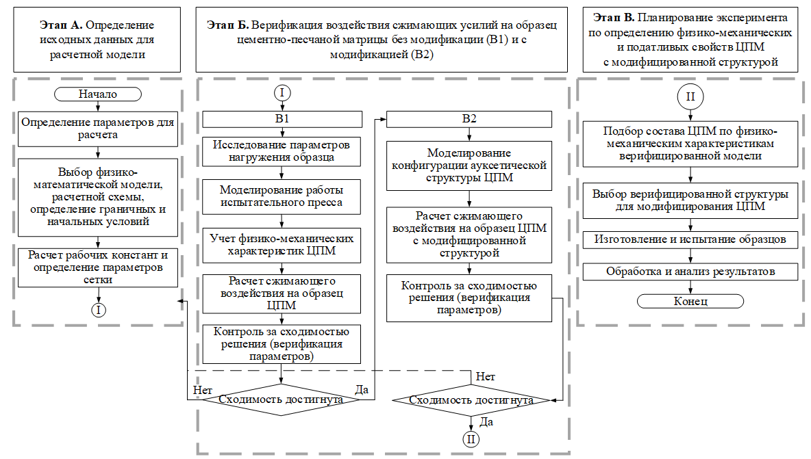 Разработка верифицированной математической модели ЦПМ бетона проводилась в программном комплексе ANSYS Static Structural, что позволило учесть нелинейные эффекты деформации и распределения напряжений в композитном материале. Алгоритм моделирования представлен на Рис. 1.
