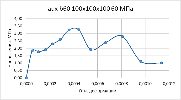 Разрушение модифицированных образцов происходит при напряжениях 8,7 МПа для В30 и 17,4 МПа для В60, что указывает на снижение прочности на сжатие в 3,3 раза для В30 и 3,4 раза для В60 по сравнению со стандартными образцами. Однако деформативность увеличивается до 10 раз, как показано на диаграммах σ-ε (Рис. 8а для В30 и Рис. 8б для В60), где податливость материала возрастает, обеспечивая повышенное энергопоглощение в ~5,6–6,85 раза.